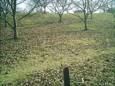 岸野さんちの玄関を入らせて貰って、裏の丘陵へ行く。この丘一帯を中心として古墳群(塚)が広がっている。