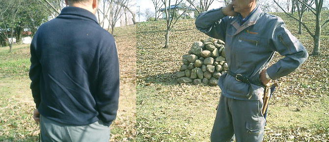丘陵は、今は一面栗林である。久保田さんが岸野さんから発掘時の様子などを聞いている。積み石の下、金の棒が立っ
