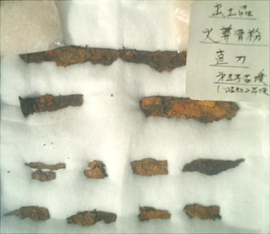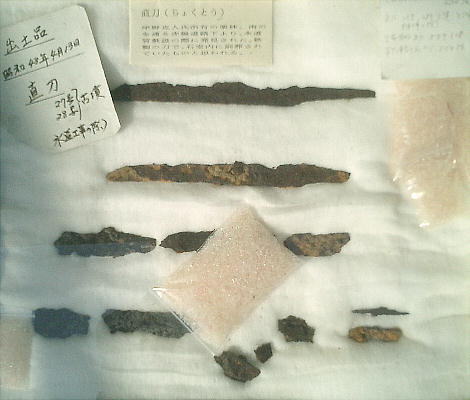 岸野克人氏所有の栗林南面を通る道路下より、水道管敷設の際に発見された。鉄製の刀で、石室内に副葬されていたもの