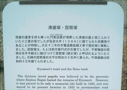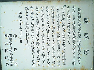 る平清盛像が立てられた。また隣には、清盛の長男で琵琶の名手だった、平経正(つねまさ)にちなんだ「琵琶塚」碑