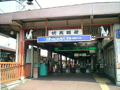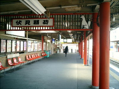 京阪電車の「伏見稲荷駅」。ホームにもお狐さんが飾ってあり、色も真っ赤に塗ってある。