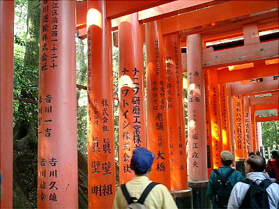 「お狐さん」を眺めながら、本殿の裏から階段を上り鳥居のトンネルをくぐって行く。我々も名を知っている様々な企業や個
