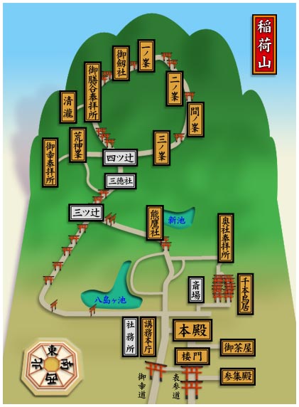 たのきみ)」が、一族の鎮守神として三柱神(宇迦之御魂大神・佐田彦命・大宮女命)を伊奈利山の三ヶ峰に祀り、神社を開