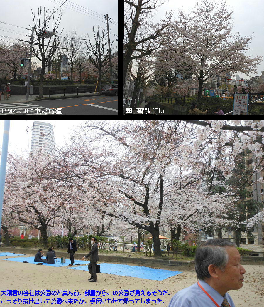 谷町のお客さんを訪ねた後、中大江公園が側なのを思い出した。もう散ってるだろうなと思ったら、あに計らんや、まだ