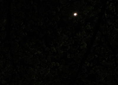 昨夜の雨にもかかわらず、まだしっかりと花を付けた桜の木。今週いっぱい位は持ちそうだ。空には書いたような三日月が。