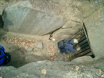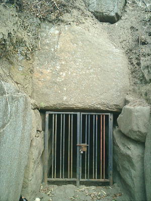 石室は鍵が掛かっていて中へは入れなかったので、鉄柵の間から手を差し入れて撮影した。前もって教育委員会に連絡する