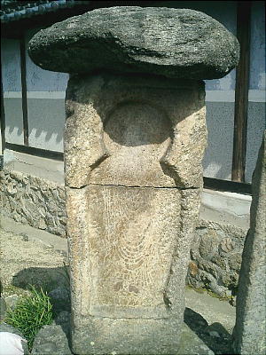 角柱状の石材を壷形に彫り込み、如来立像を線刻し、上部に扁平な自然石を乗せている。高さ94.5cm、幅44cm、彫り込み、