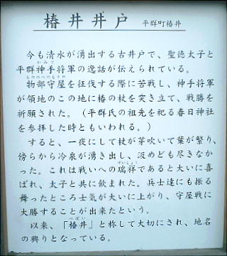 聖徳太子と平群神手(へぐりのかみて)将軍が、物部守屋討伐の際ここを訪れ、持っていた椿の椿の杖をここの地面に突き立てて戦