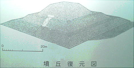廿日山(はつかやま)丘陵南側の緩斜面に築造された、一辺36b、高さ7b程の方墳で二段のテラスを持つ三段築造で、
