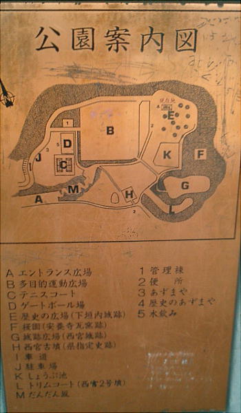 墳も曲輪の一つとして利用されていたらしい。城の主郭部は、公園化によって遺構はまったくなくなり、案内板に縄張り図