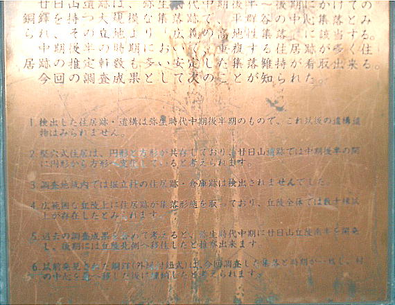 ここにはかって廿日山(はつかやま)弥生遺跡、前述した「西宮城」「下垣内城」の遺構があった。説明板によれば銅鐸も