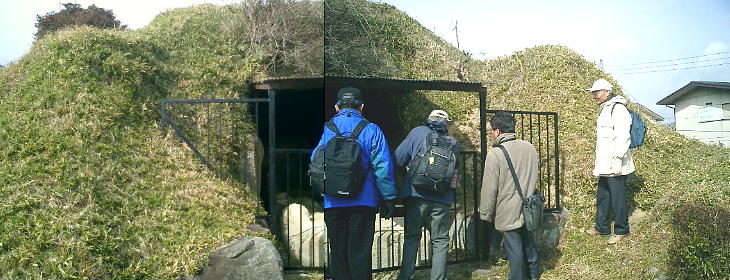 民家と民家の間にポツンと古墳が取り残されている。急な石段を昇るとすぐ石室の入り口である。