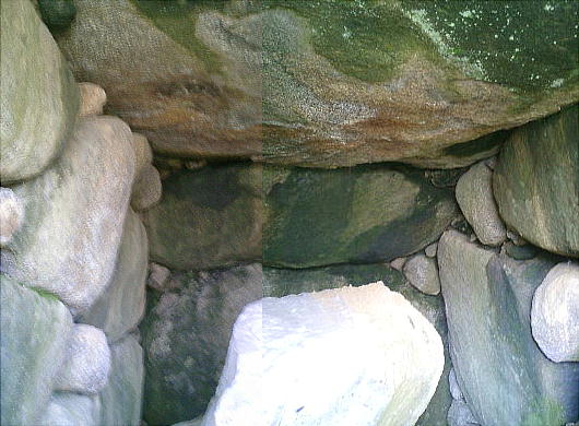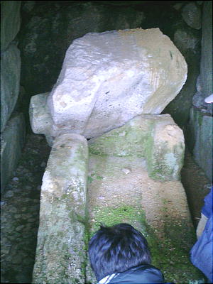 蓋は紛失している。ここも石室の天井岩はデカイ1枚岩である(下)。