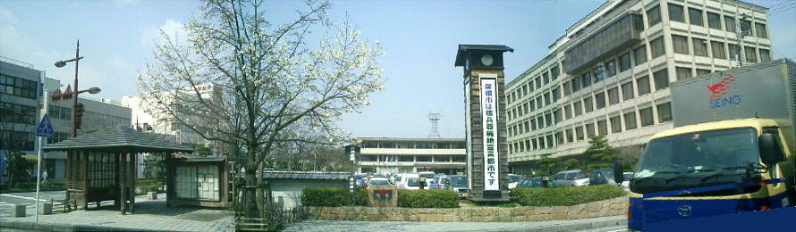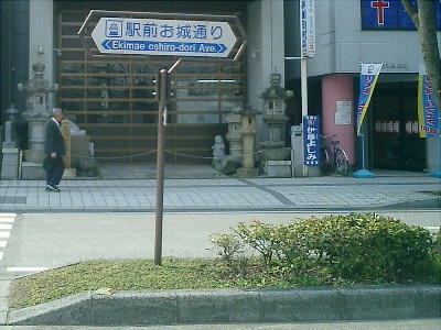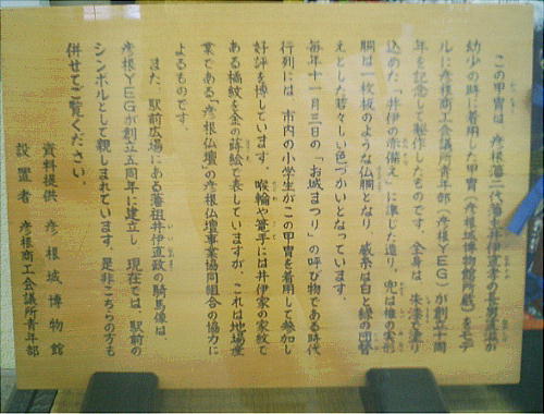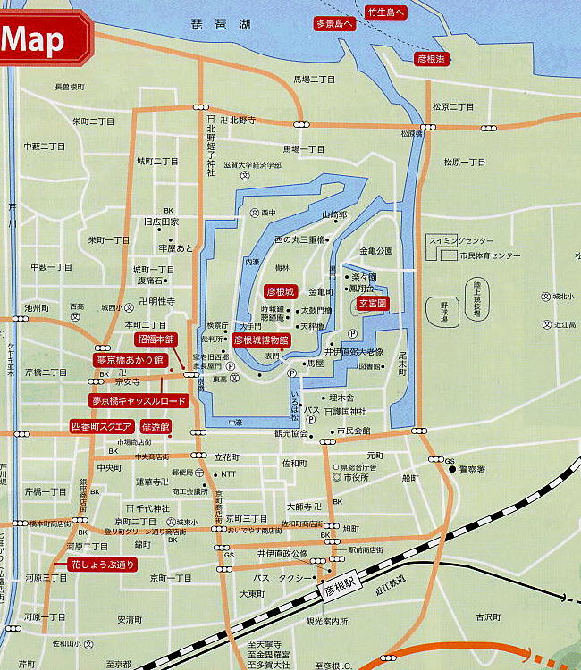 駅から城へ行く途中にある、和風作りの案内所兼休憩所のような所。右側が彦根市役所である。