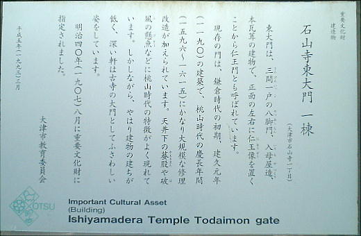 瀬田川に面して建つ東大門は、軒桁を支える組物が三手先組として格式が高く、法隆寺南大門の一手先組と比較されている。