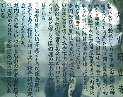 松中納言物語などの古典文学に石山詣が記される。特に本堂は、紫式部が源氏物語を書いたといい伝えられている事で有名。