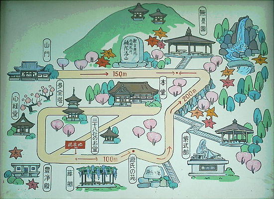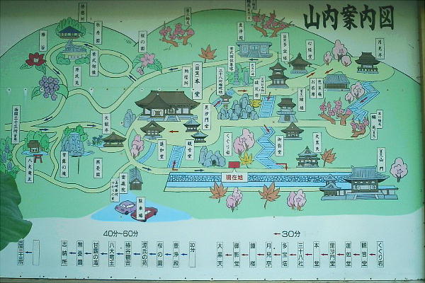急峻な地形のところに建てられており、なかなか本堂の全景を見ることはできないそうである。 また国宝の本堂には、聖徳太子
