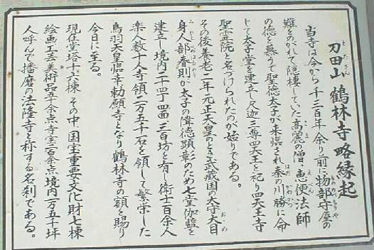 聖徳太子開創の寺、兵庫県加古川市の鶴林寺の説明板。開創当時からの歴史が書かれている。
