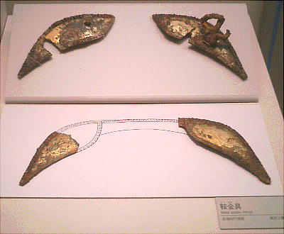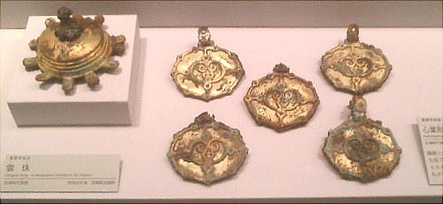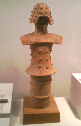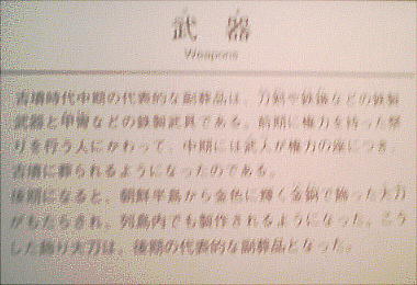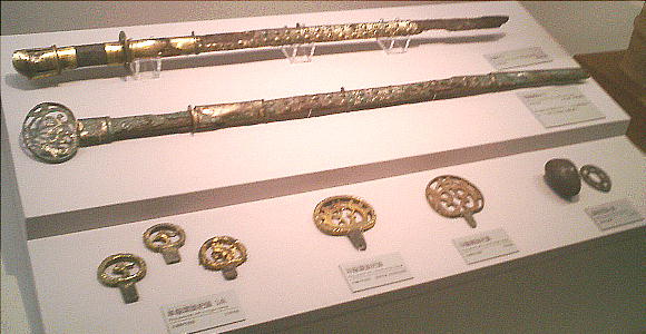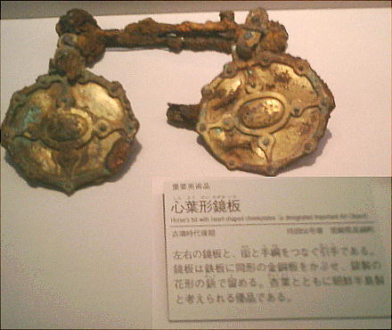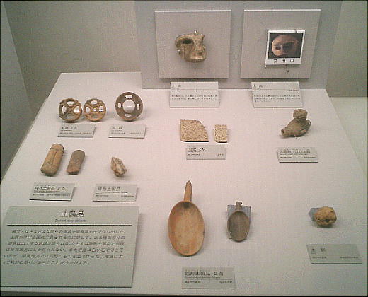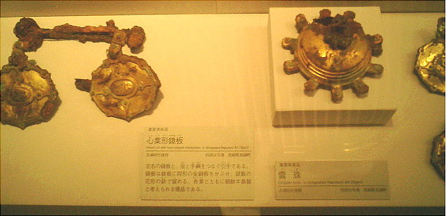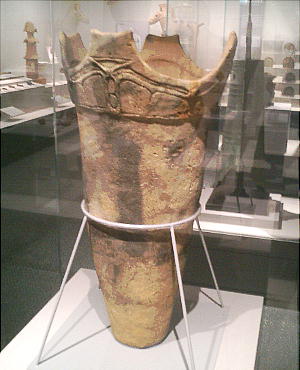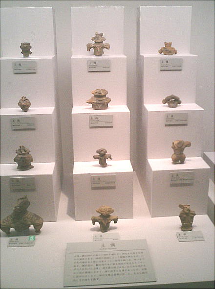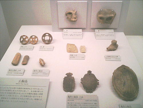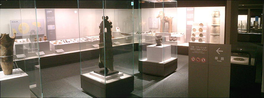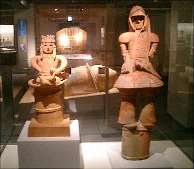 武人埴輪(上右:右)重要文化財 鉄の甲冑で全身をかため、弓矢と剣を携えた完全武装の武人である。本例と非常によく似た埴輪が数例知られる。いずれも 群馬県出土である。 正装男子埴輪(上右:左)重要文化財 冠をかぶり、髪結って頬の横に垂らし、水玉模様の服を着て腰に刀を差し、あぐらをかく権力者である。顔には化粧または 入れ墨が表わされる。