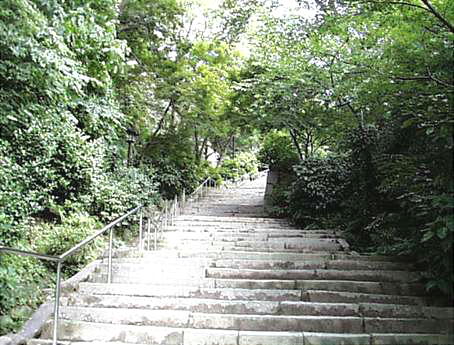 唐津城の天守閣に登るには長い石段を上ることになるが、天守閣横へ上る斜行エレベータもある。天守閣へ登る石段は222