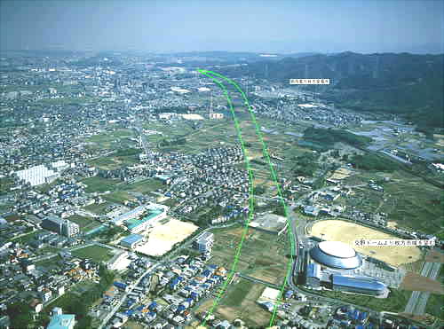 枚方市方面を望む。右下が交野ドーム。線で示された所に、現在は道路が走っている。交野ドームは綜合運動施設や多目的ホー