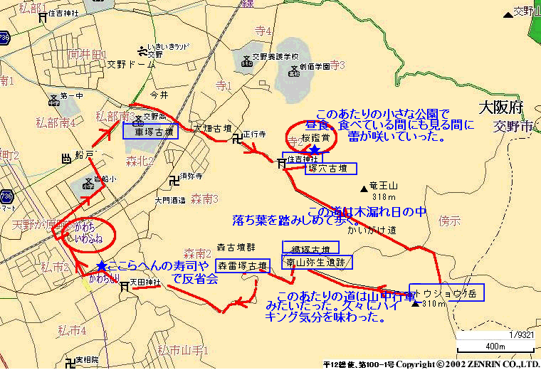 コース : JR河内磐船→船戸→交野ドーム→今井→車塚古墳→大畑古墳→住吉神社→創価の桜→塚穴古墳→かいがけ道 →