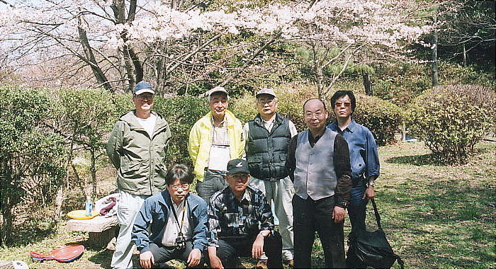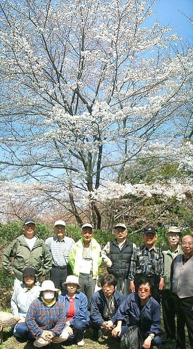 その満開の桜の下で全員で記念撮影。後ろ左から、平田さん、錦織さん、河内さん、井上、服部さん、村田さん、西本さん、