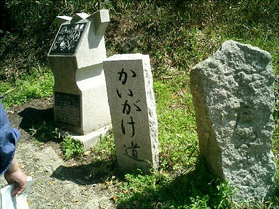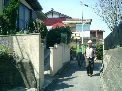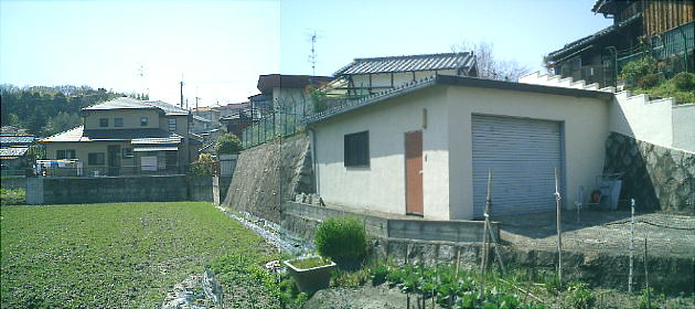 上の写真で、中央に見える高い石垣。これが前方部の先端だそうだ。この家の住人のオッサンが、何事かと我々を見ていた。