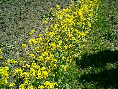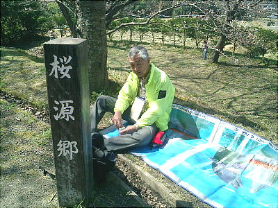 菜の花も満開である。桜は三、四分咲きだったが、1本の木だけ満開に近かった。下の「桜源郷」の杭はコンクリート製。