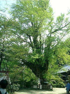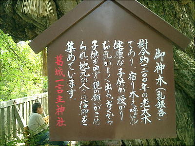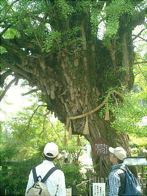 本殿の正面にそびえ立っていて、樹齢1200年と言われている。見上げると枝からお乳のような格好をした気根