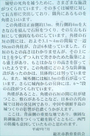 高めるために築かれたと考えられる。なお,角楼の存在,石垣の間に立つ柱,敷石が巡っていることは,日本の古代山城で