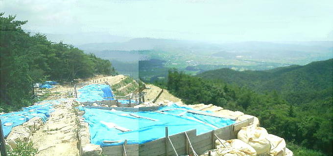 城壁は、一段一列に並べ置いた列石の上に、土を少しづつ入れてつき固めた版築土塁で、平均幅約7m、推定高は約6mで
