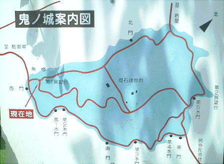 鬼ノ城遺跡の全体を見て歩くには一日二日では回りきれない。現地においてあるハイキングコースの地図も5,6種類あっ