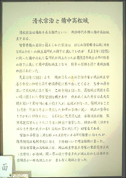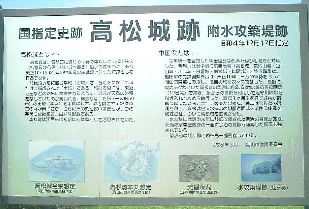 て、この遺跡は吉備路の中でもあまり顧みられない所だったが、最近水攻めの堤防跡等が発掘調査されこの話が本当であったと一