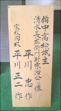 説明してくれているオジサンの後ろに3枚の掛け軸があるが、あの一番右がホントの清水宗治の辞世の句だった。