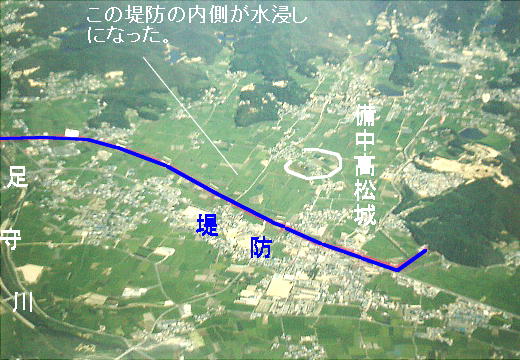 さらに土嚢を1袋幾らでこれまた近在の農民に競わせてかき集め、12日間で沼地を取り囲む堤防を作り上げた。高松城の中にい
