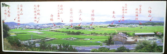 円形の説明板に、水攻めの地形と誰がどこに布陣していたかという布陣図が作られている。その先には土蔵
