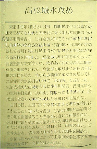 吉により水攻めを開始され、同年6月4日、城兵を助ける事を条件に、城主清水宗治が切腹、落城することとなる。