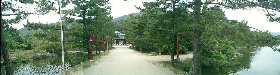 「おかまでん」。吉備津神社の拝殿から南に続く長い回廊を経て、右手に見える入母屋造りの建物。死後もうなり続けた温羅の首