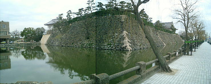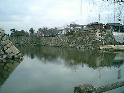 だ。商店街の中を抜けて国道沿いに歩いていくと、消防署の先にお城の濠が見えてくる。消防署員が訓練をしていた。
