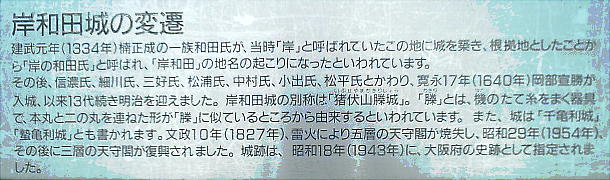 現在の岸和田市一帯は、古くはただ「岸」と呼ばれていたようだ。戦国時代頃までは現在の二の丸跡近くまで潮が押し寄せていたとい