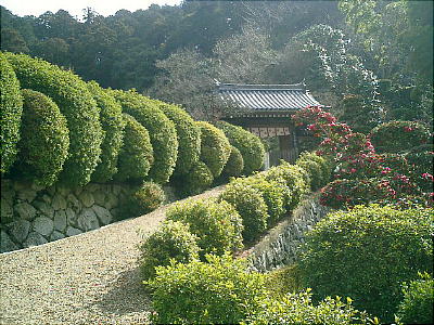 広い境内は四季折々の花で彩られ、とりわけ数百株に及ぶというサツキはみごとらしい。また、大和地方では珍しい、裏山を借