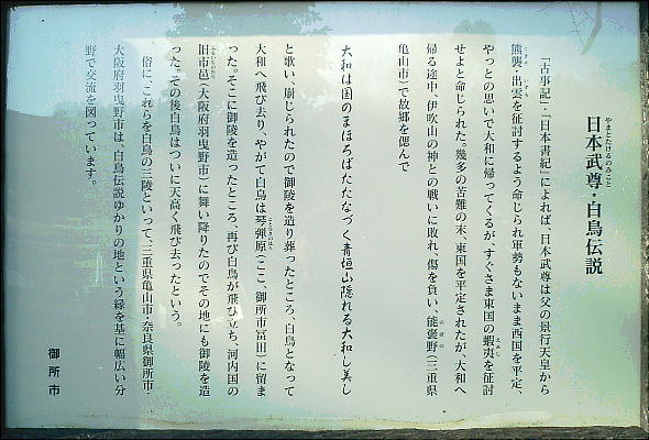 るようになったという。伝説に基づいて、日本武尊の墓は三重県亀岡市・奈良県御所市・大阪府羽曳野市の三市にあり、一般に