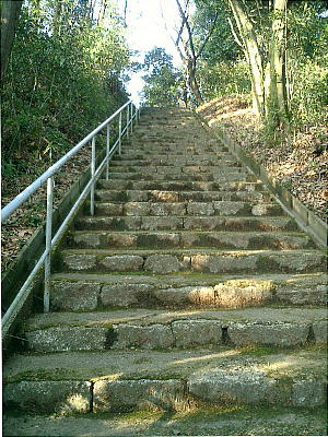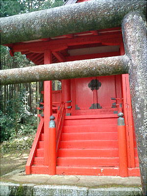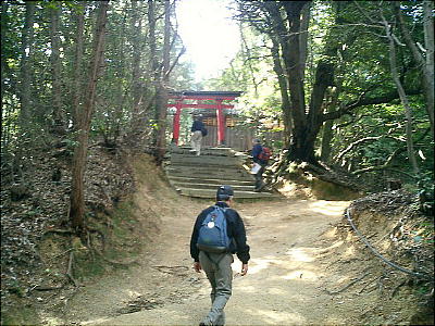 渡って、標高322mの唐笠山(宮山)の麓から薄暗い林の中を歩き出すと、石造りの古ぼけた鳥居があった。そこから急な道