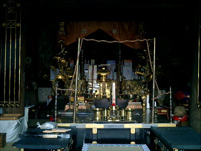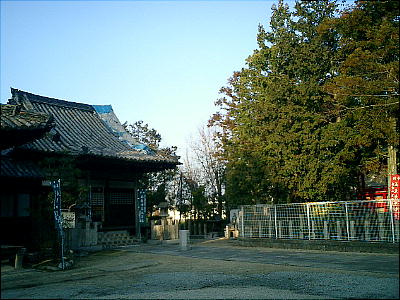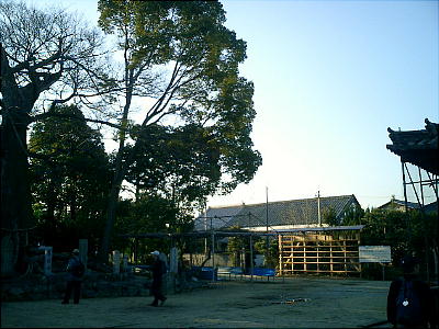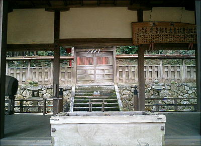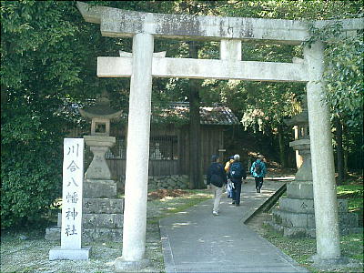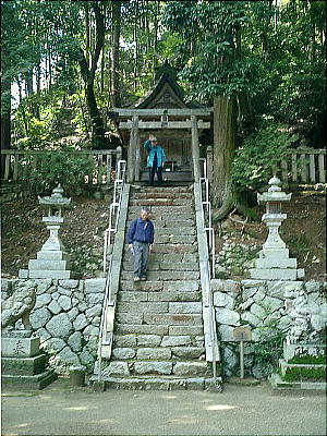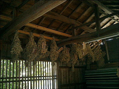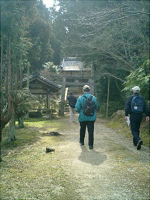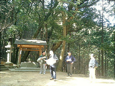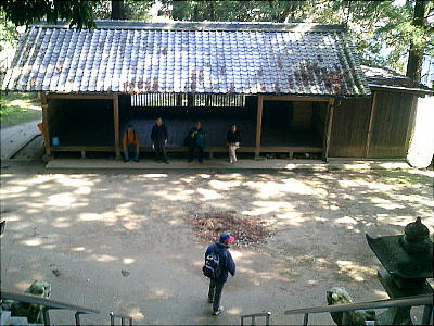 拝殿背後の板囲いの中にカシとツツジの木を神体として祀っているらしい。静寂な空気が漂う神社の境内で昼食をとる。拝殿