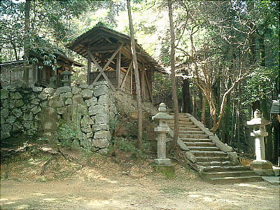 山頂の開けたところに拝殿がある。拝殿は石垣の上に建てられ、砦のような形をしている。石段を登ってみると磐座がある。