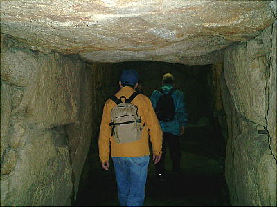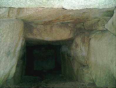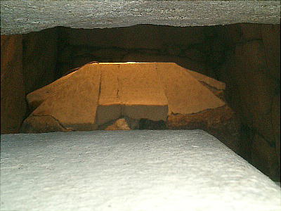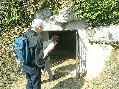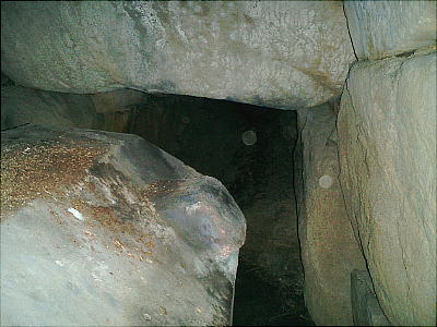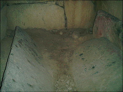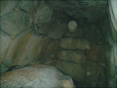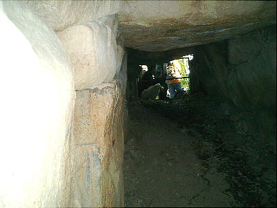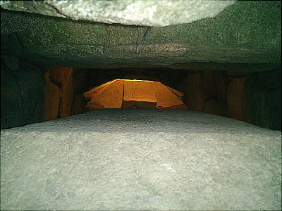 入り口から玄室を見たところ(上左)と、玄室から入り口を見たところ(上右)。羨道も結構長い。