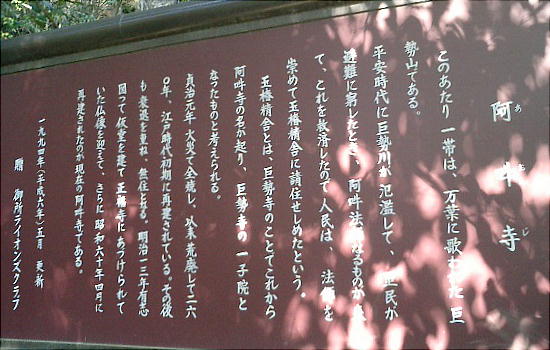 平安時代に、阿吽法師が水害に悩むこの地の住民を救い、請われて玉椿精舎と呼ばれた巨勢寺に入り再興を果たしたことからこの