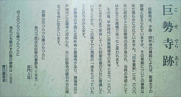 巨勢寺は7世紀の飛鳥時代に建立された巨勢氏の氏寺であったと伝えられ、7世紀から10世紀の頃この地で栄え、巨勢寺の一