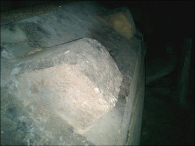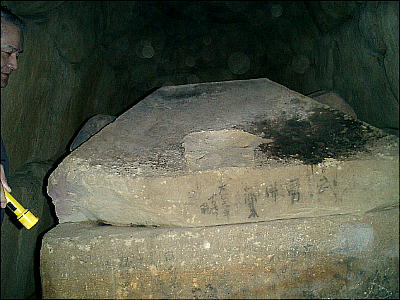 を持っていたので河原さんと中に入ってみる。照らしてみると、大きな箱形石棺が横たわっていて、その後ろには、板状の石
